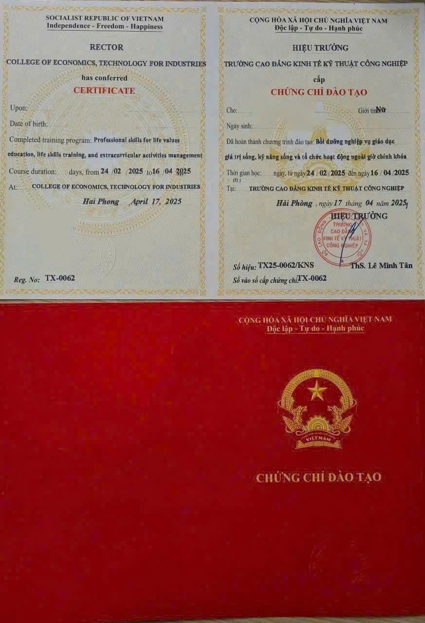 🔖 Sau khi hoàn thành, bạn sẽ được cấp chứng chỉ Kỹ năng sống để hỗ trợ công việc giảng dạy, đào tạo hoặc làm việc trong lĩnh vực giáo dục.